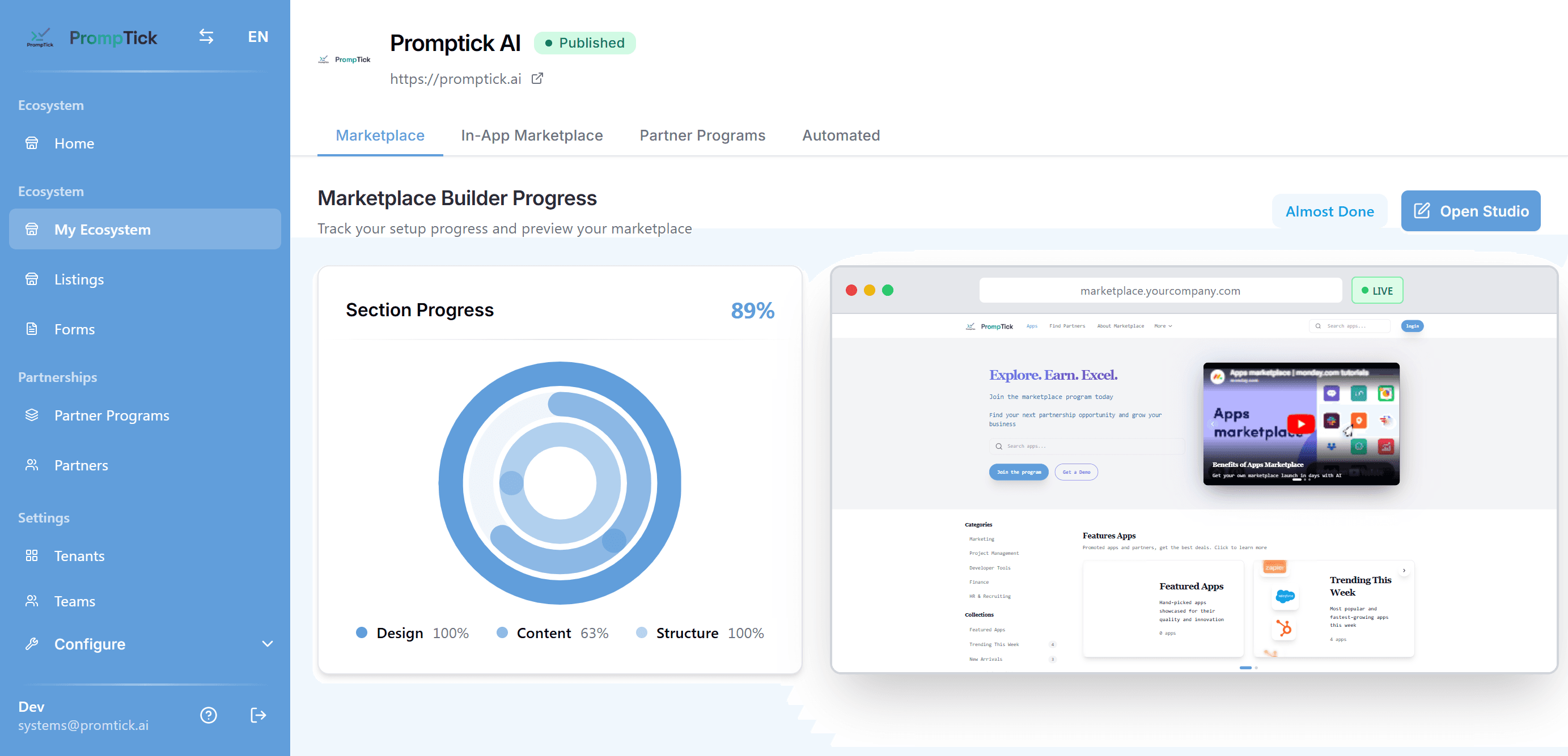 Multi-Portal: Main UI, Partner Portal, Marketplace Portal, and Super Admin Portal for different user roles